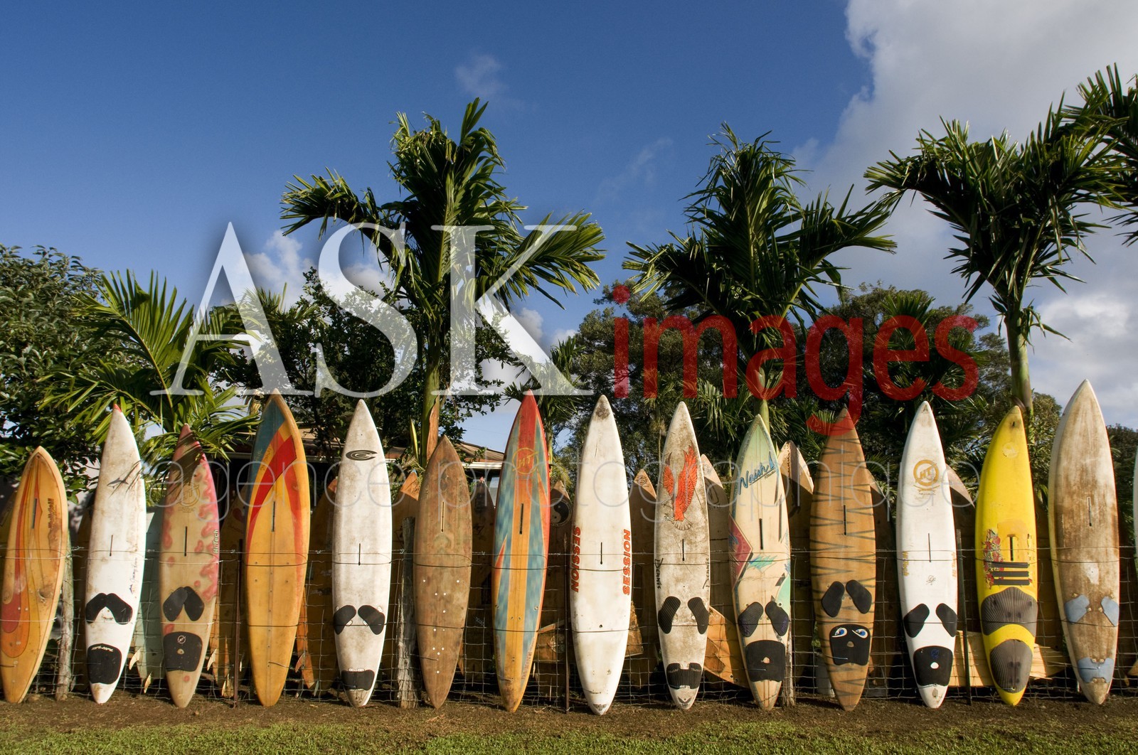 Surfboards decoration in a garden. Huelo. Hawaii. Huelo is a small community located along the Road to Hana (Hana Highway). It is considered part of Haiku.