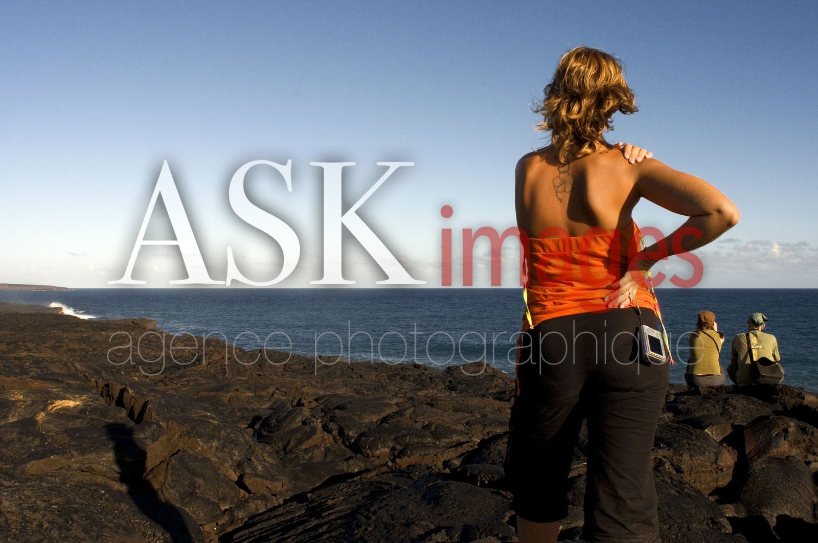 | Description | Black lava mountains near the coast and highway Chain of Crater Road. Hawai'i Volcanoes National Park. Big Island. Hawaii. Woman with a tattoo. |