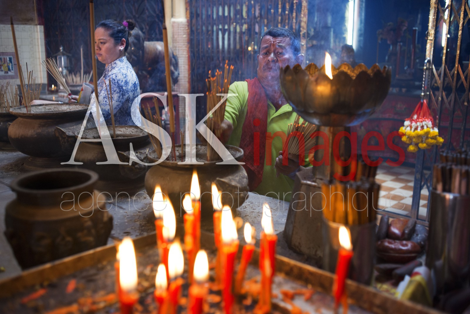 | Description | People prayer with candles incense sticks, Temple complex in the Trang Buddhist Temple. Trang, also called Mueang Thap Thiang, is one of the southern provinces of Thailand |