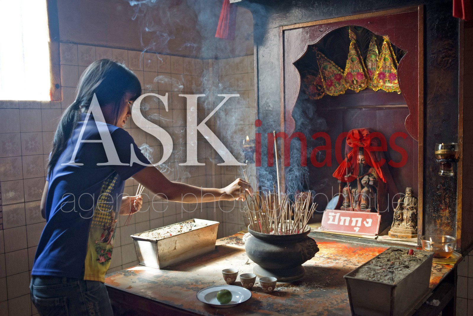 | Description | Woman in prayer holding incense sticks, Temple complex in the Trang Buddhist Temple. Trang, also called Mueang Thap Thiang, is one of the southern provinces of Thailand |