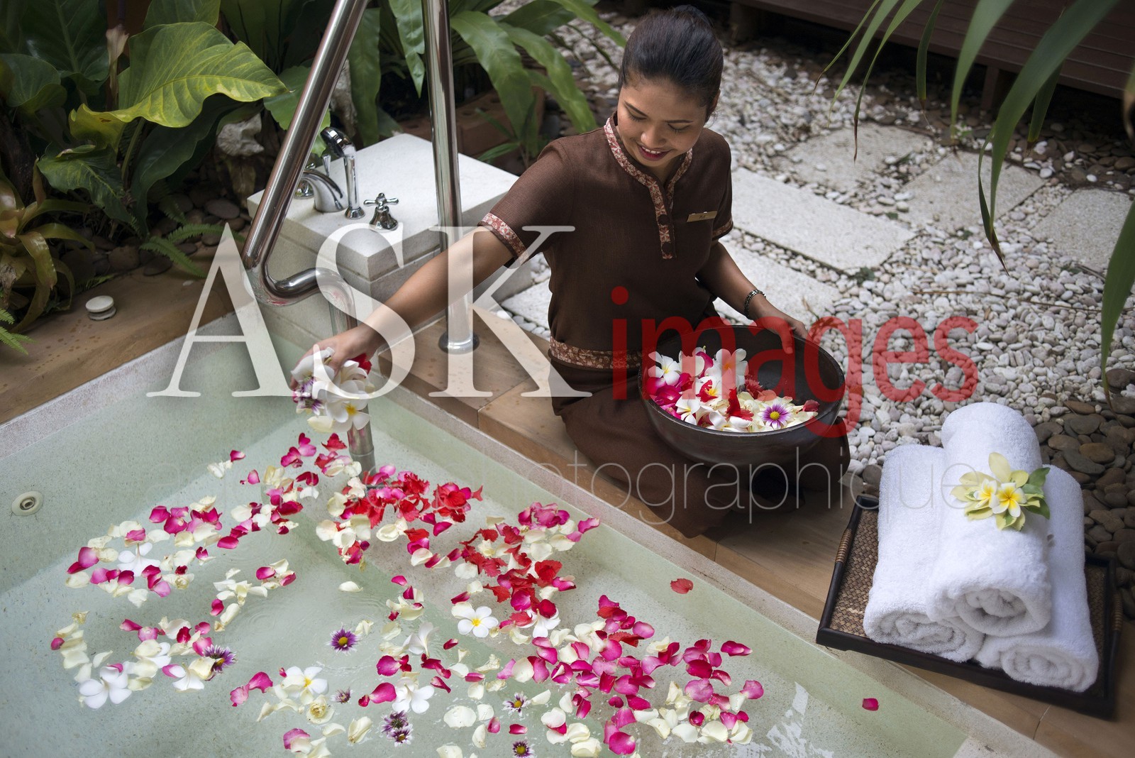 | Description | Preparing the bath with flowers and bath salls in the Spa of Anantara Si Kao Resort & Spa, south of Krabi, Thailand. |